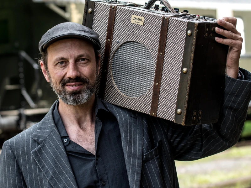 Mi compañero HoBo⬀ y yo hacemos un duo muy original y divertido. Holger «HoBo» Daub⬀ toca la armónica y, aunque su música es el blues, buscamos juntos en distintos estilos que dan a nuestro espectáculo mucha variedad.